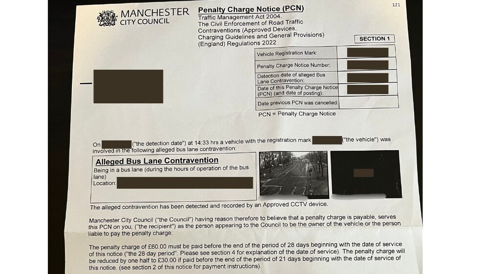 マンチェスターにはトラムやバスの専用レーンがありますが、バス専用レーン(時間帯制限あり)に気づかずに走ってしまっていたみたいで、監視カメラ(CCTV)にしっかり捉えられていました。